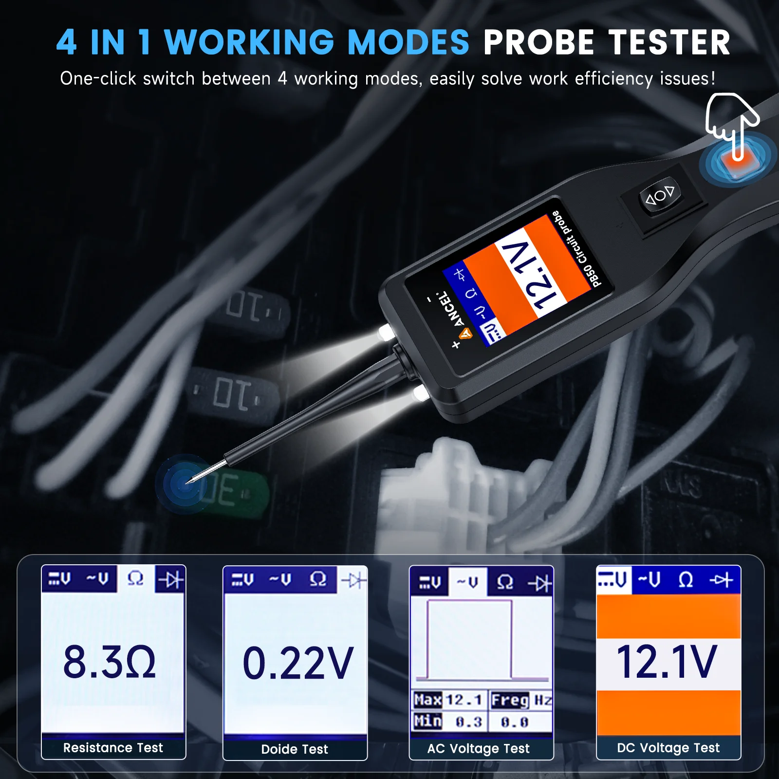 • 💫【4 IN1 Power Circuit Probe Tester】: The ANCEL PB50 probe tester offers four versatile working modes, easily accessed with a single press of the Mode Button: ✅DC Voltage Mode ✅AC Voltage Mode ✅Resistance Mode ✅Doide Mode. The PB50 is the ultimate circuit probe tester to meet all your car electrical system needs.
