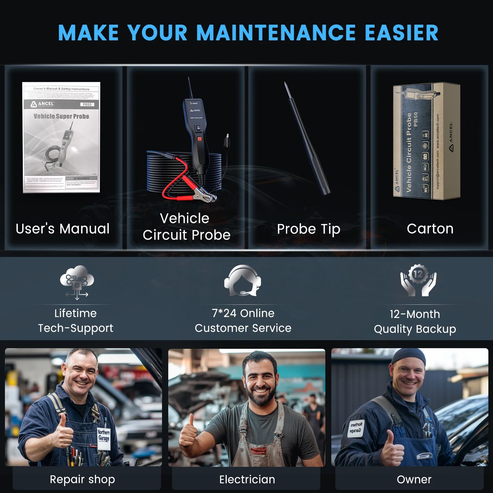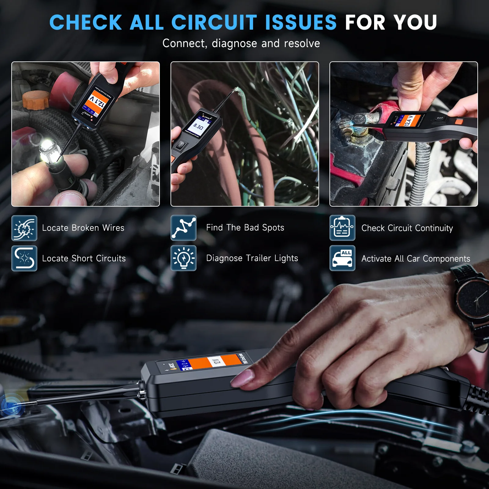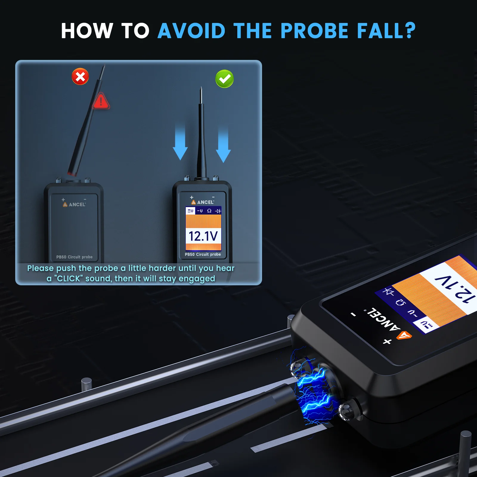 • ❣️【Auto Circuit Protection】: Circuit breaker is a valuable tool for easily testing short circuits, while also serving as a crucial safety feature to protect the device from overload. Ancel PB50 power circuit testers kit has a built-in circuit breaker, which shuts down and restarts whenever it is overloaded, to prevent circuit overload and overheating.